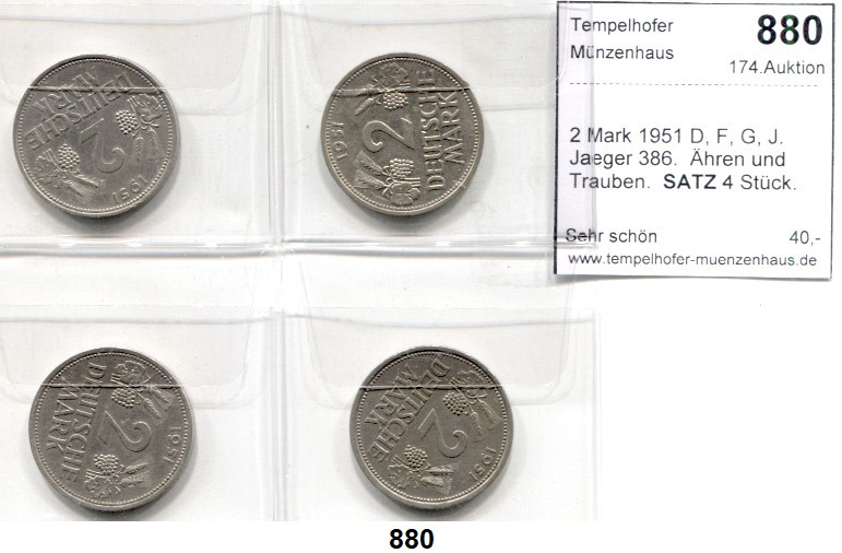 0880. B U N D E S R E P U B L I K 2 Mark 1951 D, F, G, J. Jaeger 386. Ähren und Trauben. SATZ. 4 Stück. Bundesrepublik Katalogseite Auktion: 174 Losnummer: 0880 Erhaltung: Sehr schön Schätzpreis: 40,00 €