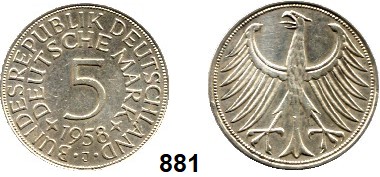 0881. B U N D E S R E P U B L I K 5 Mark 1958 J. Jaeger 387. Bundesrepublik Katalogseite Auktion: 174 Losnummer: 0881 Erhaltung: Sehr schön Schätzpreis: 200,00 €