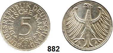 0882. B U N D E S R E P U B L I K 5 Mark 1958 J. Jaeger 387. Bundesrepublik Katalogseite Auktion: 174 Losnummer: 0882 Erhaltung: Sehr schön Schätzpreis: 200,00 €