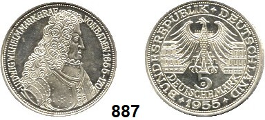 0887. B U N D E S R E P U B L I K 5 Mark 1955 G. Jaeger 390. Markgraf von Baden. Bundesrepublik Katalogseite Auktion: 174 Losnummer: 0887 Erhaltung: Fast prägefrisch Schätzpreis: 120,00 €