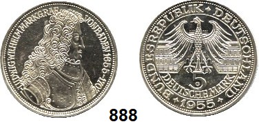 0888. B U N D E S R E P U B L I K 5 Mark 1955 G. Jaeger 390. Markgraf von Baden „Türkenlouis“. Index: Baden-Baden Bundesrepublik Katalogseite Auktion: 174 Losnummer: 0888 Erhaltung: Vorzüglich Schätzpreis: 80,00 €