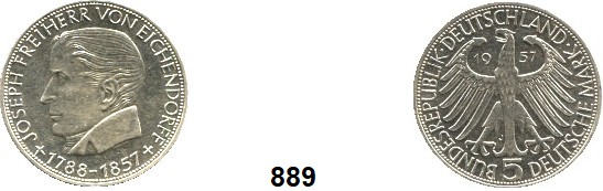0889. B U N D E S R E P U B L I K 5 Mark 1957 J. Jaeger 391. Joseph Freiherr von Eichendorff. Index: Eichendorff, Josef von Bundesrepublik Katalogseite Auktion: 174 Losnummer: 0889 Erhaltung: Vorzüglich – prägefrisch Schätzpreis: 100,00 €