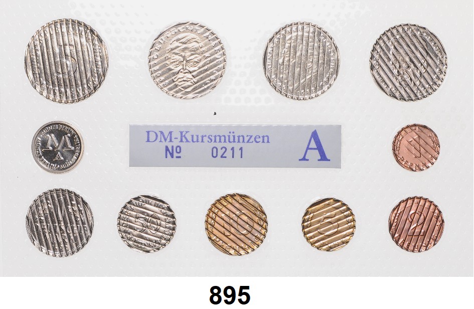 0895. K U R S M Ü N Z E N – S Ä T Z E Münzsatz. Entwertete DM der Münze Berlin „A“. 1 Pfennig bis 5 Mark (10 offiziell entwertete DM Münzen und kleine Medaille der Münze Berlin). Bundesrepublik Katalogseite Auktion: 174 Losnummer: 0895 Erhaltung: Vorzüglich Orig. Schätzpreis: 25,00 €