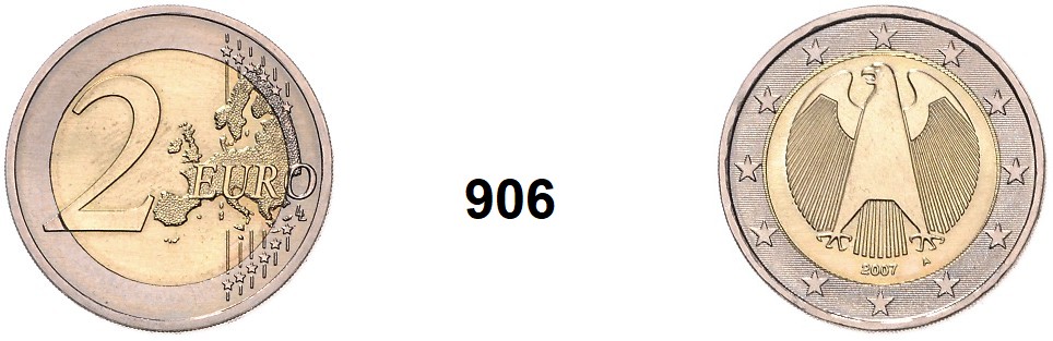 0906. Verprägungen und Kuriositäten 2 Euro 2007 A. PROBE. 8,42 Gramm. Jaeger 489 a. Siehe Anm. im Jaeger-Katalog „Den Jahrgang 2007 gibt es nicht“. Index: Probe (Essai) Bundesrepublik Katalogseite Auktion: 174 Losnummer: 0906 Erhaltung: Vorzüglich – prägefrisch Schätzpreis: 500,00 €