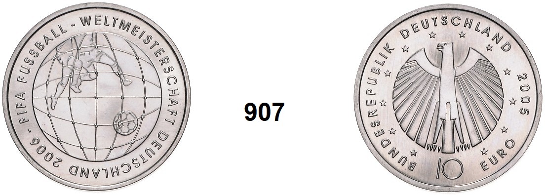 0907. Verprägungen und Kuriositäten Probeprägung ohne Randschrift. Silber. 17,74 Gramm. 10 Euro 2005. Fußball Weltmeisterschaft in Deutschland. Jaeger 511. Index: Probe (Essai) Bundesrepublik Katalogseite Auktion: 174 Losnummer: 0907 Erhaltung: Prägefrisch Schätzpreis: 500,00 €