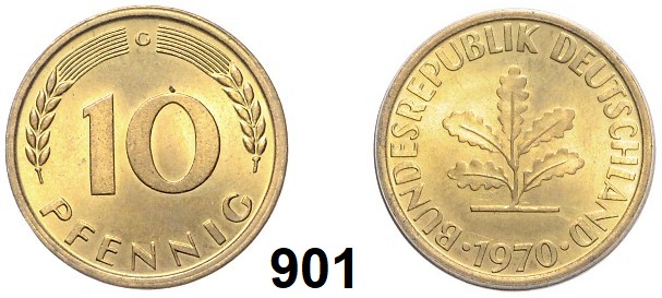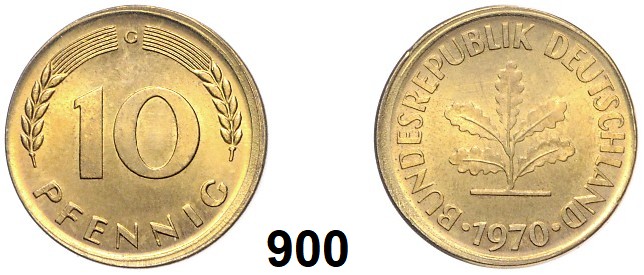 0900. Verprägungen und Kuriositäten 10 Pfennig 1970 G. Verprägung – Außerhalb des Rings geprägt. 22,2 mm. 4,03 g. Jaeger 383. Bundesrepublik Katalogseite Auktion: 174 Losnummer: 0900 Erhaltung: Vorzüglich – prägefrisch Schätzpreis: 30,00 €