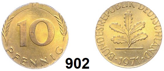 0903. Verprägungen und Kuriositäten 10 Pfennig 1971 G. Verprägung – Dezentriert 10 %. 22,5 mm. 4 g. Jaeger 383. Bundesrepublik Katalogseite Auktion: 174 Losnummer: 0903 Erhaltung: Vorzüglich – prägefrisch Schätzpreis: 20,00 €