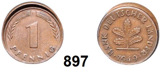 0897. Verprägungen und Kuriositäten 1 Pfennig 1949 J. Verprägung – Dezentriert 10 %. 18 mm. 2 g. Jaeger 376. Bundesrepublik Katalogseite Auktion: 174 Losnummer: 0897 Erhaltung: Sehr schön Schätzpreis: 25,00 €