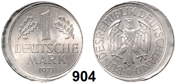 0904. Verprägungen und Kuriositäten 1 Mark 1971 D. Verprägung – Dezentriert 10 %. 24,5 mm. 5,46 g. Jaeger 385. Bundesrepublik Katalogseite Auktion: 174 Losnummer: 0904 Erhaltung: Vorzüglich – prägefrisch Schätzpreis: 30,00 €