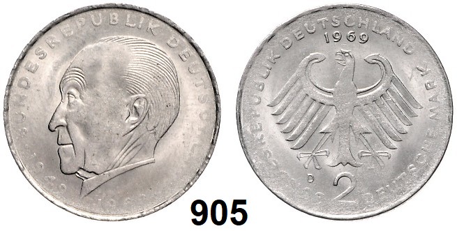 0905. Verprägungen und Kuriositäten 2 Mark 1969 D. Adenauer. Fehlprägung – Geprägt auf dünnem Schrötling (magnetisch). 3,73 g statt 7 g. Jaeger 406. Index: Verprägungen / Fehlprägungen Bundesrepublik Katalogseite Auktion: 174 Losnummer: 0905 Erhaltung: Vorzüglich Schätzpreis: 50,00 €