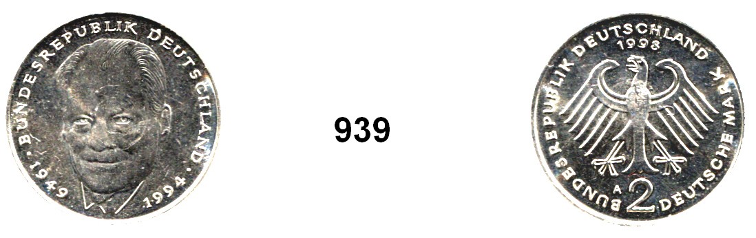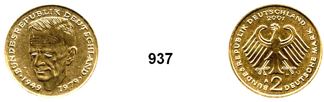 2 Mark 2001 A. Kurt Schumacher. Jaeger 424. Prägung auf artfremden Schrötling. Messingfarbend (Kupfer-Zink-Schrötling). Rand glatt. 7,84 Gramm. Die Ausprägung mit Schumacher als Motiv endete 1993 (!).