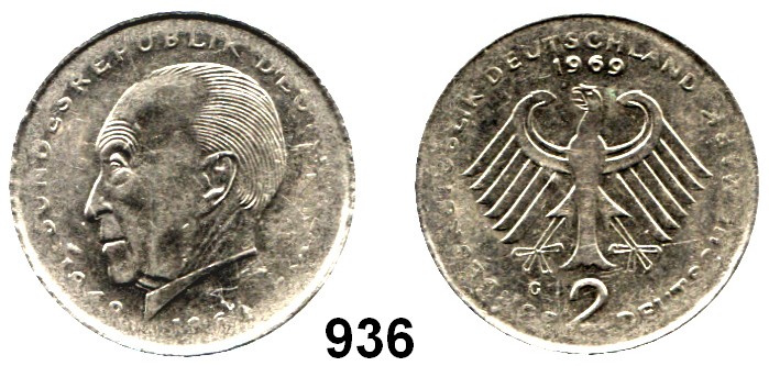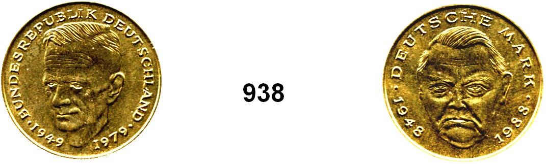 2 Mark. Zwitterprägung. Kopfbild Kurt Schumacher und Kopfbild Ludwig Erhard. Prägung auf artfremden Schrötling. Jaeger 424/445. Messingfarbend (Kupfer-Zink-Schrötling). Rand glatt. 7,93 Gramm.