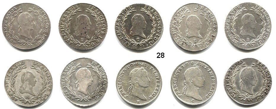 1/4 Kreuzer 1782 A, 1800 A; 1/2 Kreuzer 1800 A; 1 Kreuzer 1780 W, 1782 B, 1790 S, 1800 A, B, C, E, G, S; 3 Kreuzer 1800 A, B, C, S; 6 Kreuzer 1800 A, B, C, E. LOT 20 Stück. Auf einem Tablett.