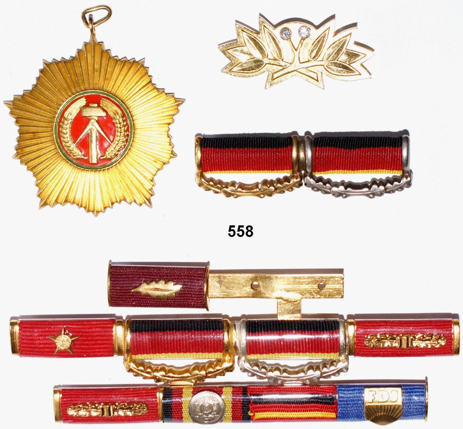 Vaterländischer Verdienstorden Gold (900, 71 g) mit der Ehrenspange in 900er Gold (21,5 g) und zwei echten Brillanten. So verliehen von 1965 bis 1972. Dazu 9 Interimsspangen auf Interimsspangenblock (eine Freistelle für die Ehrenspange). Dazu 2er Interimsspange mit VVO in Gold (900, ca. 14 g.) und Silber (900).