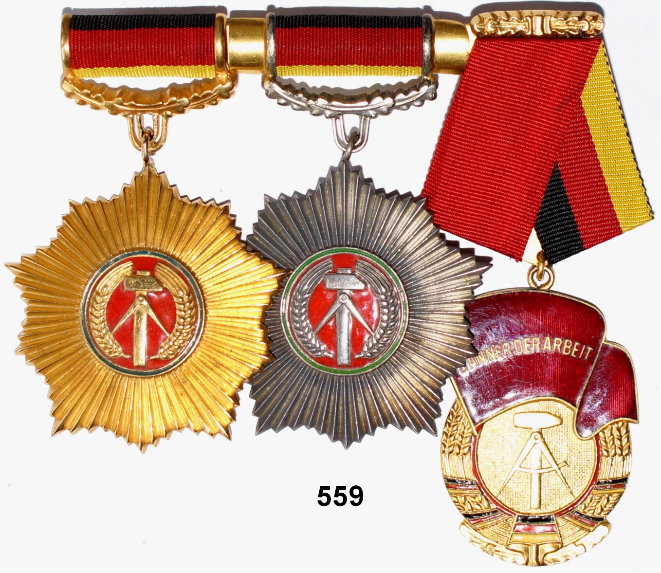 Ordensspange, Vaterländischer Verdienstorden in Gold (900, 63,6 g) an goldener (900) Tragespange (ca. 20 g.); Silberner Vaterländischer Verdienstorden (900) an silberner (900) Tragespange und Orden Banner der Arbeit, ohne Stufenangabe.