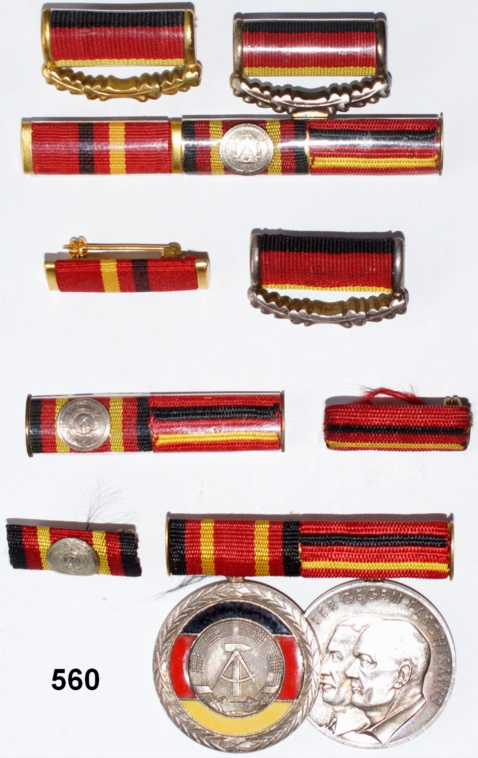Orden, Ehrenzeichen, Militaria, Zeitgeschichte,Deutschland DDR LOT von Interimsspangen und zwei Abzeichen.  Darunter Interimsspange VVO in Gold (900, 16,2 g) gelöst von einer 5er Spange mit silberner Interimsspange VVO.  Interimsspange VVO in Silber (900).  Spange mit zwei Abzeichen, Verdienstmedaille der DDR und Medaille Kämpfer gegen den Faschismus, dazu Interimsspangen und 3 weitere Interimsspangen.