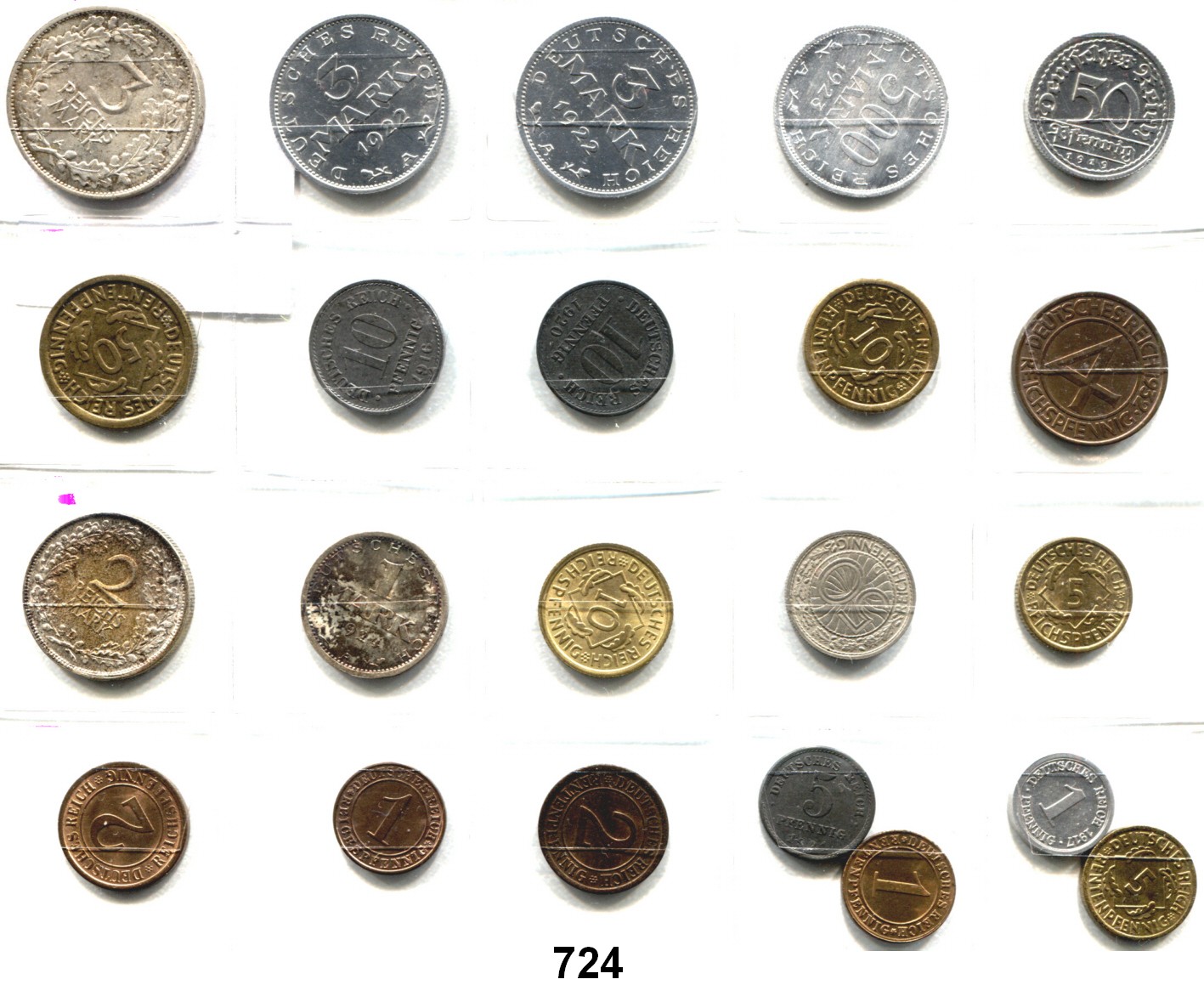 Typensammlung von 22 Münzen. Jaeger 297 bis 321. Darunter 50 Pfennig 1919 E; 50 Rentenpfennig 1924 J; 1 Mark 1924 A; 2 Reichsmark 1926 D und 3 Reichsmark 1925 A „Rheinland“.