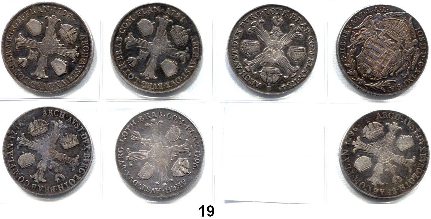 0019. Haus Habsburg LOTS LOTS LOTS Madonnentaler 1782 B; Kronentaler 1784 B; 1791 M; 1795 M; 1796 H und M(2). LOT 7 Stück. Römisch Deutsches Reich Katalogseite Auktion: 160 Losnummer: 0019 Erhaltung: Teilweise Felder bearbeitet, schön bis sehr schön Schätzpreis: 200,00 € Zuschlag: 340 €
