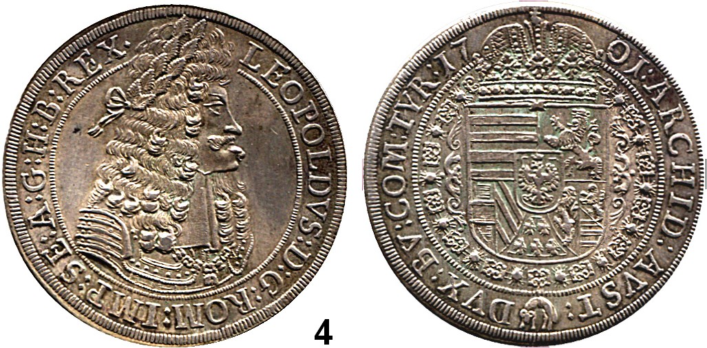 0004.Haus Habsburg Leopold I. 1657 – 1705 Taler 1701 Hall. 28,8 g. Herinek 649. Voglhuber 221/VII. Dav. 1003 Römisch Deutsches Reich Katalogseite Auktion: 160 Losnummer: 0004 Erhaltung: Feine Tönung, vorzüglich – prägefrisch Schätzpreis: 300,00€