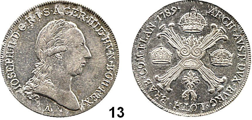0013. Haus Habsburg Josef II. 1765 – 1790 1/2 Kronentaler 1789 A, Wien. 14,71 g. Herinek 195. Römisch Deutsches Reich Katalogseite Auktion: 160 Losnummer: 0013 Erhaltung: Vorzüglich Schätzpreis: 30,00 € Zuschlag: 50 €