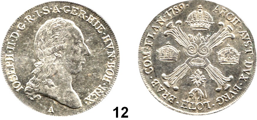 0012. Haus Habsburg Josef II. 1765 – 1790 1/2 Kronentaler 1789 A, Wien. 14,78 g. Herinek 195. Römisch Deutsches Reich Katalogseite Auktion: 160 Losnummer: 0012 Erhaltung: Vorzüglich – prägefrisch Schätzpreis: 40,00 € Zuschlag: 90 €