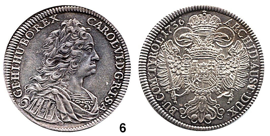 0006. Haus Habsburg Karl VI. 1711 – 1740 Taler 1736, Hall. 28,94 g. Herinek 354. Voglh. 259/V. Dav. 1055. Römisch Deutsches Reich Katalogseite Auktion: 160 Losnummer: 0006 Erhaltung: Vorzüglich Schätzpreis: 150,00 € Zuschlag: 300 €