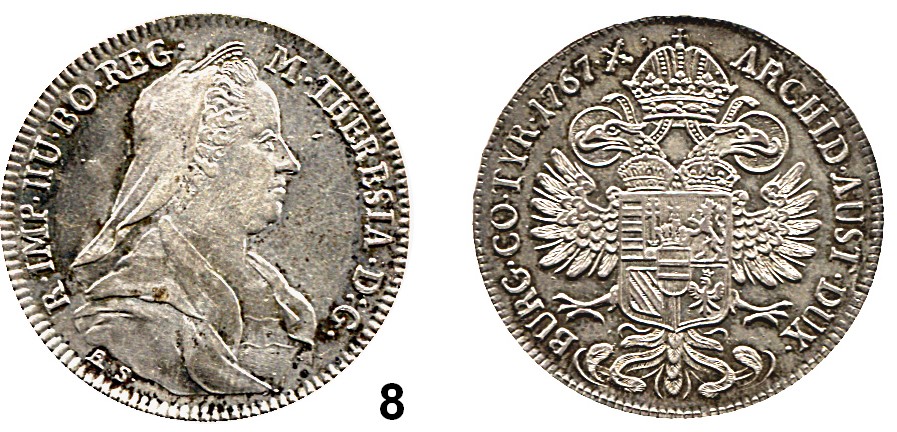 0008.Haus Habsburg Maria Theresia 1740 – 1780 1/2 Taler 1767 A.S., Hall. 14,01 g. Herinek 660 Römisch Deutsches Reich Katalogseite Auktion: 160 Losnummer: 0008 Erhaltung: Leicht justiert, Patina, vorzüglich Schätzpreis: 100,00 €