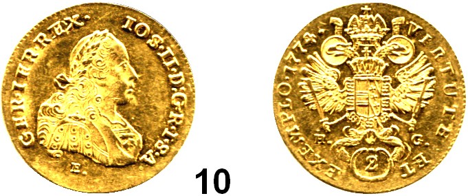 0010.Haus Habsburg Josef II. 1765 – 1790 2 Dukaten 1774 E, H-G, Karlsburg, für Siebenbürgen. 6,98 g. Herinek 10. KM 1860. Fb. 191 (Ungarn). GOLD Römisch Deutsches Reich Katalogseite Auktion: 160 Losnummer: 0010 Erhaltung: Vorzüglich Schätzpreis: 500,00 €