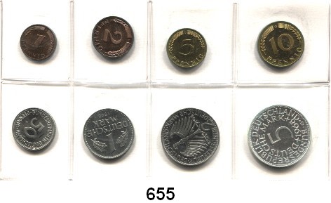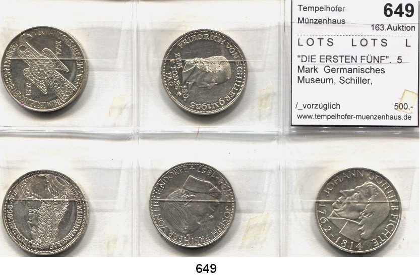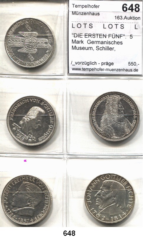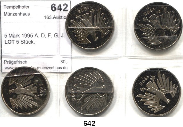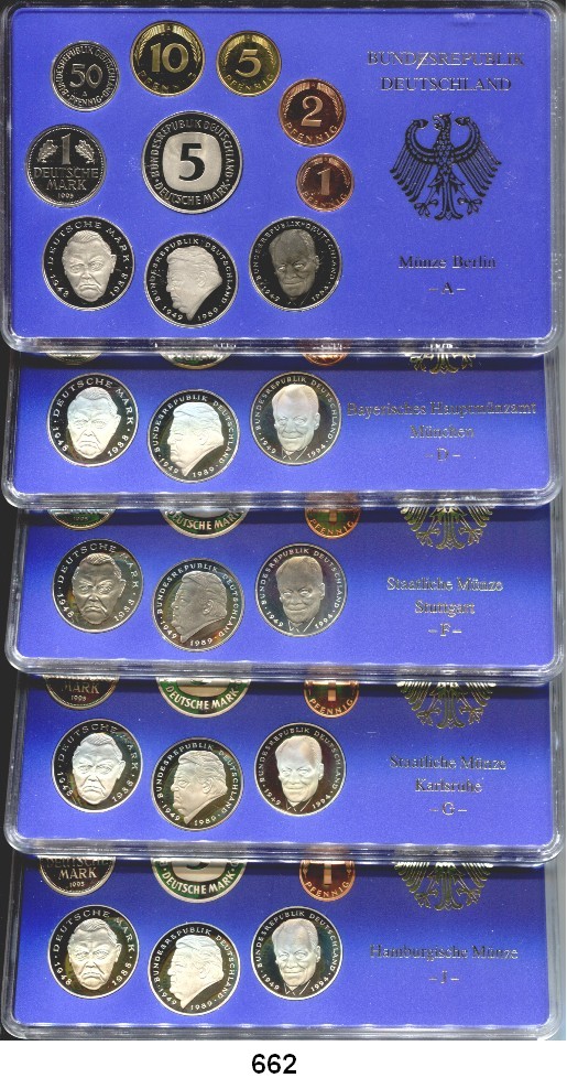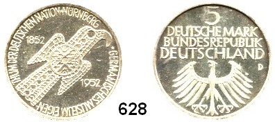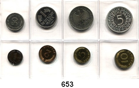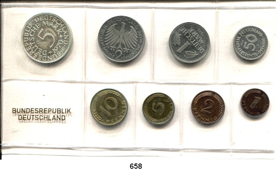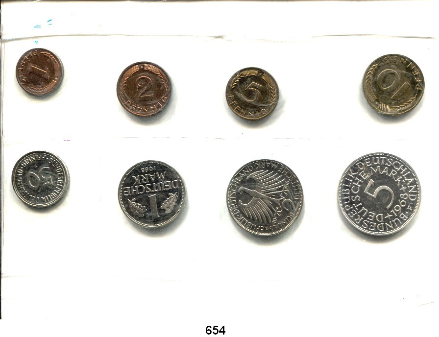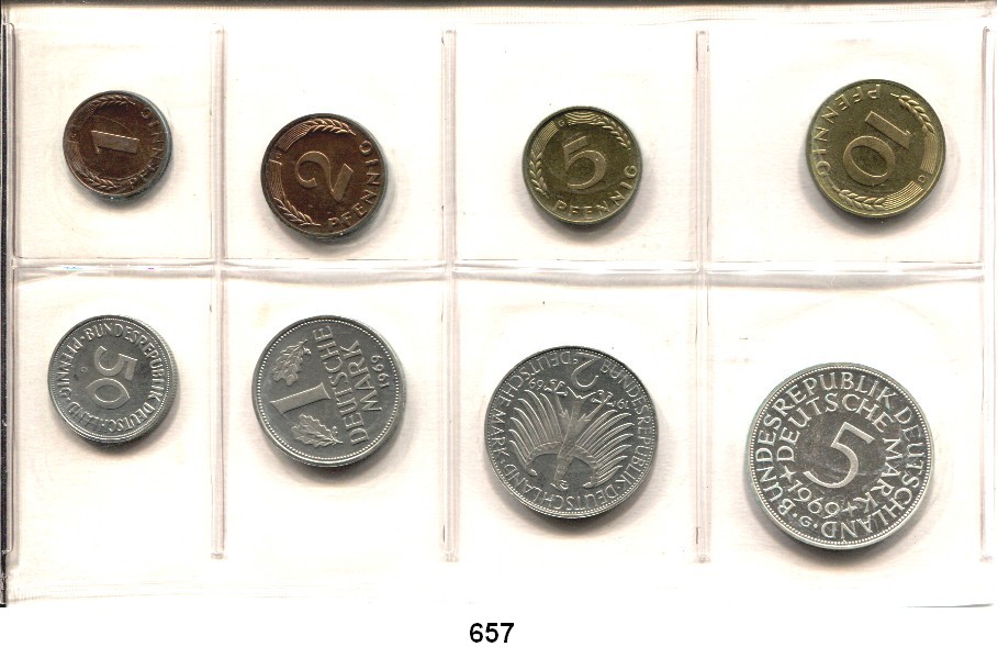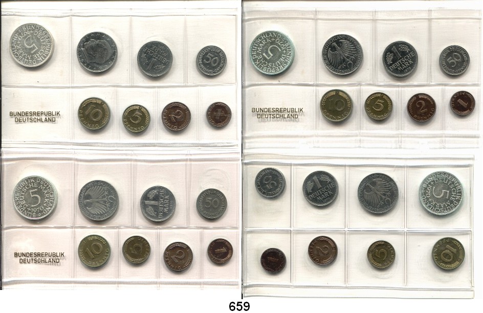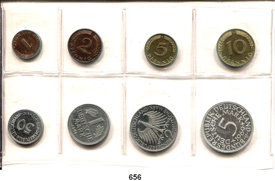 Sammlung von 1087 Kurs- und Gedenkmünzen von 1 Pfennig bis 10 Euro. Darunter 50 Pfennig(133); 1 Mark(173); 2 Mark Max Planck(54) 2 Mark(31); 5 Mark „Silberadler“(26); 5 Mark Gedenkmünzen ab Fichte(33); 10 Euro-Gedenkmünzen(25). In zwei Münzkisten mit je 8 Tabletts