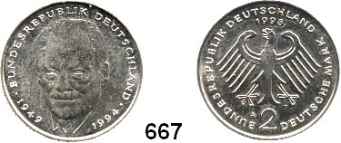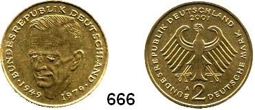 2 Mark 2001 A. Kurt Schumacher. Jaeger 424. Prägung auf artfremden Schrötling. Messingfarbend (Kupfer-Zink-Schrötling). Rand glatt. 7,82 Gramm. Die Ausprägung mit Schumacher als Motiv endete 1993 (!).