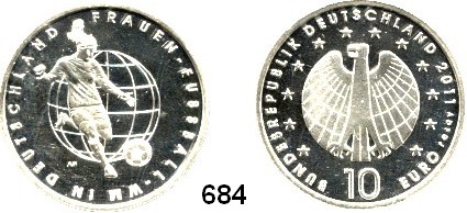 10 EURO-Probe 2011 D. Jaeger 561. Geprägt auf Silberschrötling. Es handelt sich um den Originalentwurf, der Stempelkünstlerin Hoyer, bei dem das Wort „Frauen – Fussball“ durch einen Bindestrich getrennt worden ist, bei der regulären Prägung wurde das Wort zusammengeschrieben. Siehe Anmerkung im Katalog Jaeger. 16 Gramm.