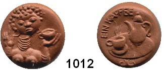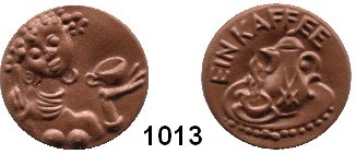 Moderne Wertmarke „EIN KAFFEE“ o.J.(1980) braun. 22,6 mm. 9,2 mm stark. Diese Marke wurde als Kaffeemarke in der Abteilung Gestaltung verwendet. Weigelt 7284.
