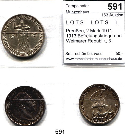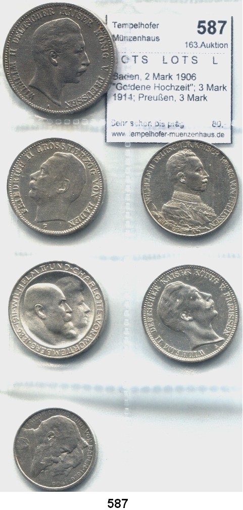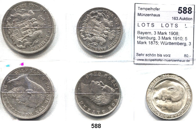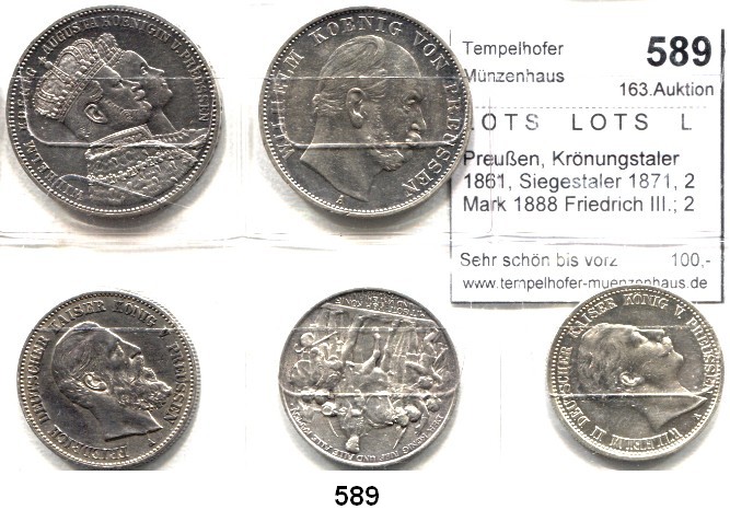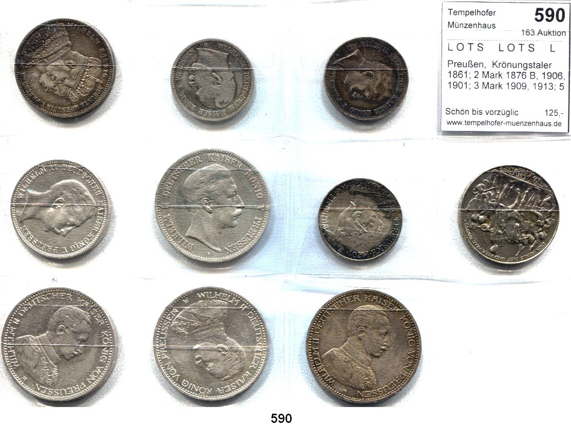 Preußen, Krönungstaler 1861; 2 Mark 1876 B, 1906, 1901; 3 Mark 1909, 1913; 5 Mark 1898, 1913(3). Kahnt 385; Jg. 96, 102, 103, 104, 105, 110, 114(3). LOT 10 Stück.