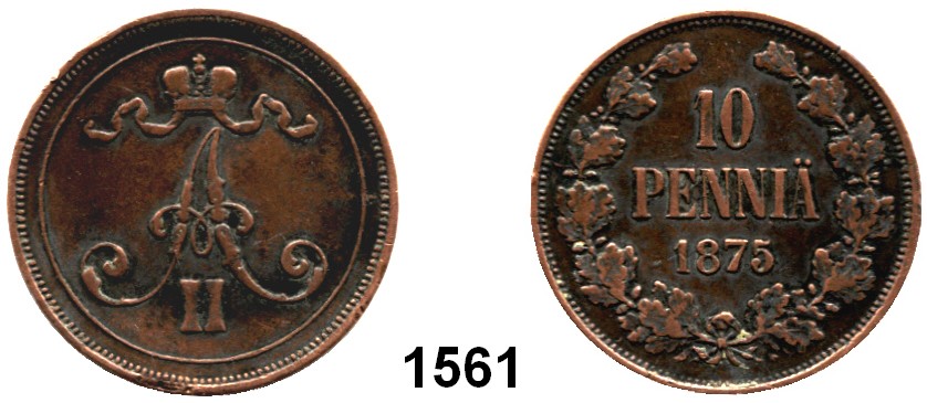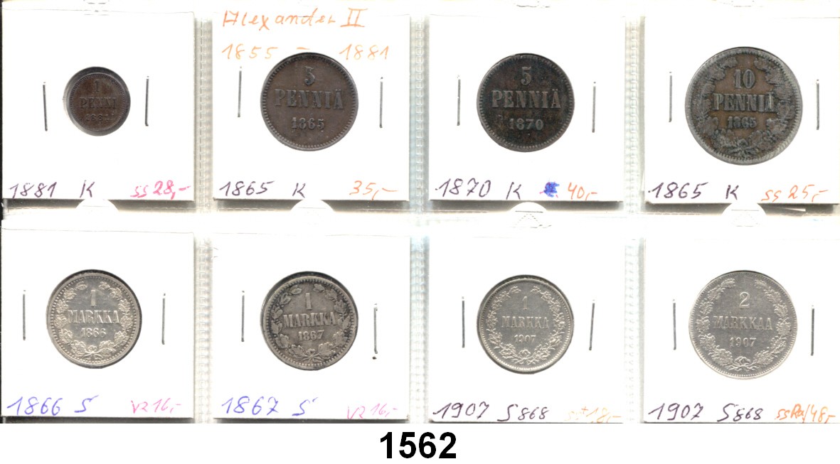Jahrgangssammlung in einem Ordner.. 321 Münzen von 1 Penni bis 1000 Markkaa. Darunter 37 Silbermünzen u.a. 1 Penni 1881; 5 Penniä 1865, 70, 72, 73, 75, 88, 89, 97, 1901, 05; 10 Penniä 1865, 66, 67, 76, 1905, 07, 08, 09, 10, 11, 12; 25 Penniä 1875, 1 Markka 1866, 67, 1907, 15; 2 Markkaa 1907; 500 Markkaa 1952. Jeweils im Münzrähmchen.