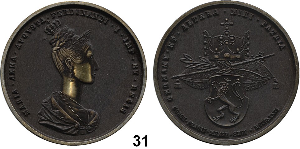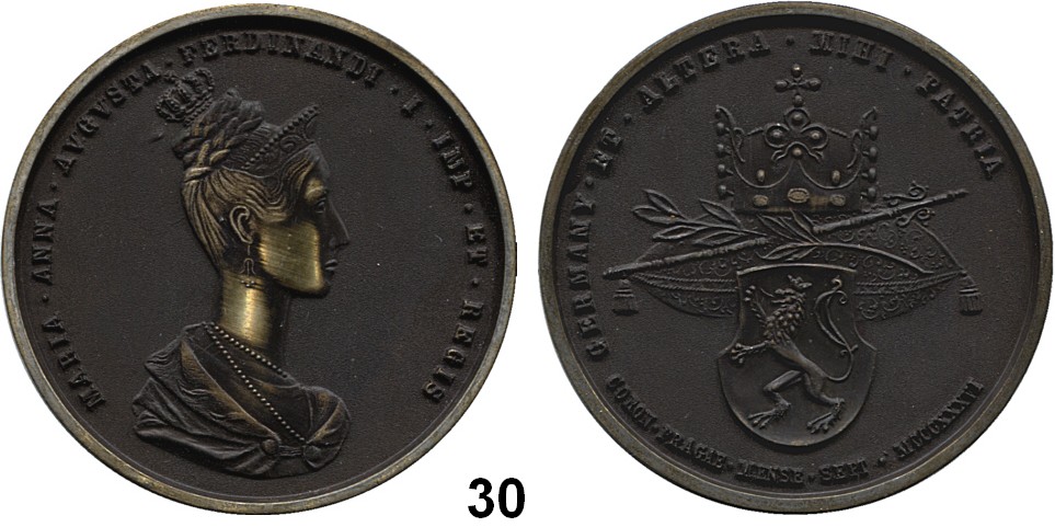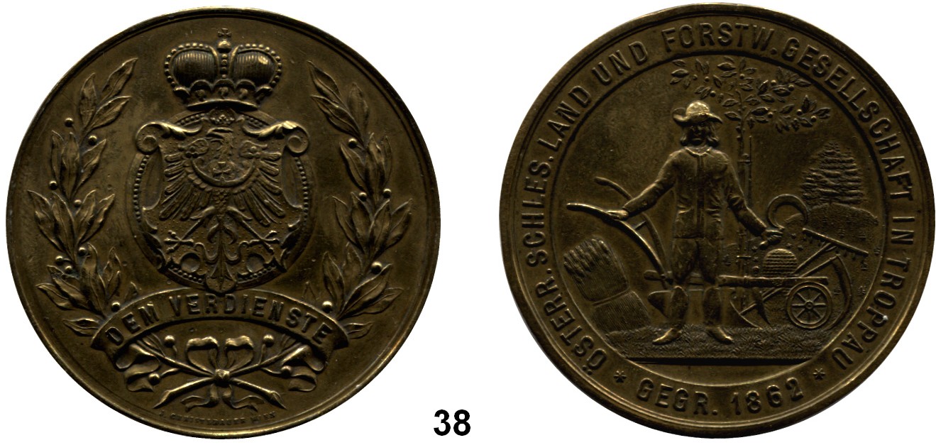 Bronzemedaille o.J. (um 1900, J. Christlbauer, Wien) der Österreichisch-Schlesischen Land- und Forstwirtschaftsgesellschaft in Troppau, für Verdienste. Gekröntes Wappen von Schlesien zwischen Lorbeerzweigen, unten Schriftband. / Landwirt vor Symbolen. 52 mm. 51,88 g.