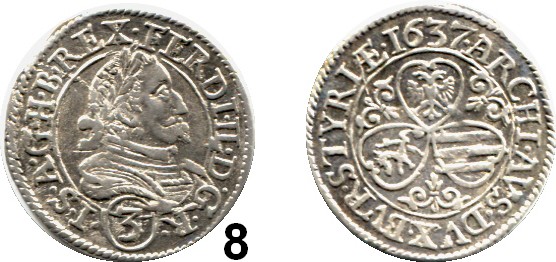 0008. Haus Habsburg Ferdinand II. 1619 – 1637 3 Kreuzer 1637, Graz. 1,83 g. Herinek 1099. Römisch Deutsches Reich Katalogseite Auktion: 164 Losnummer: 0008 Erhaltung: Sehr schön – vorzüglich Schätzpreis: 30,00 € Zuschlag: 42,00 €