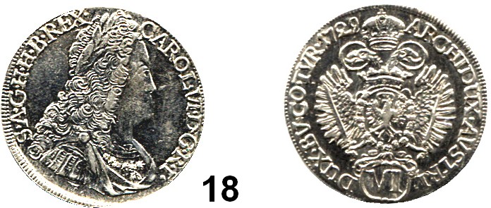 0018. Haus Habsburg Karl VI. 1711 – 1740 6 Kreuzer 1729, Hall. 2,90 g. Herinek 671. Römisch Deutsches Reich Katalogseite Auktion: 164 Losnummer: 0018 Erhaltung: Vorzüglich Schätzpreis: 30,00 € Zuschlag: 65,00 €