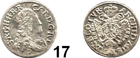0017. Haus Habsburg Karl VI. 1711 – 1740 1 Kreuzer o.J.(1724), Hall. 0,82 g. Herinek 890. Römisch Deutsches Reich Katalogseite Auktion: 164 Losnummer: 0017 Erhaltung: Vorzüglich Schätzpreis: 30,00 € Zuschlag: 46,00 €