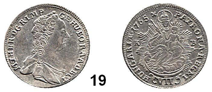 0019. Haus Habsburg Maria Theresia 1740 – 1780 7 Kreuzer 1765 KB, Kremnitz. 3,17 g. Herinek 1255. Römisch Deutsches Reich Katalogseite Auktion: 164 Losnummer: 0019 Erhaltung: Sehr schön + Schätzpreis: 30,00 € Zuschlag: 100,00 €