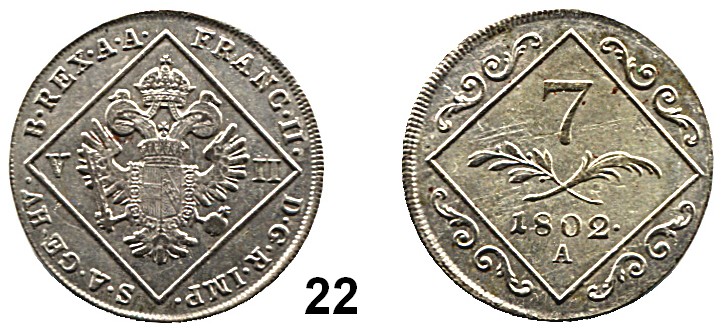 0022. Haus Habsburg Franz II. 1792 – 1806 (1835) 7 Kreuzer 1802 A, Wien. Herinek 884. Jl. 116. KM 2129. Römisch Deutsches Reich Katalogseite Auktion: 164 Losnummer: 0022 Erhaltung: Vorzüglich Schätzpreis: 30,00 € Zuschlag: 55,00 €