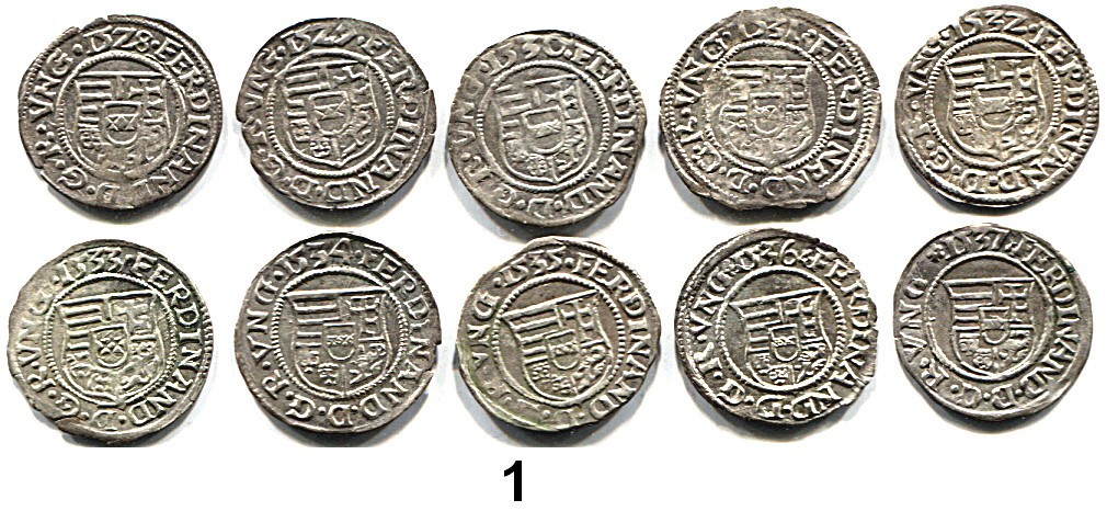 0001. Haus Habsburg Ferdinand I. 1521 – 1564 Denar für Ungarn, KB, Kremnitz. Sammlung. 10 Stück von 1528 bis 1537. Römisch Deutsches Reich Katalogseite Auktion: 164 Losnummer: 0001 Erhaltung: Sehr schön bis vorzüglich Schätzpreis: 80,00 € Zuschlag: 110,00 €
