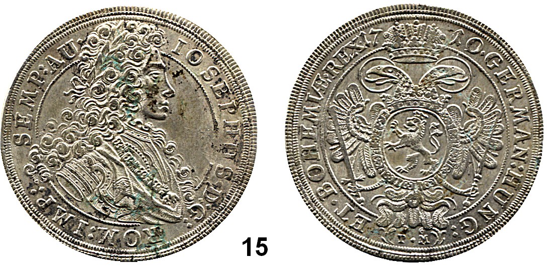 0015. Haus Habsburg Josef I. 1705 – 1711 Taler 1710 PM (aus 09), Prag. 28,6 g. Herinek 137. Voglh. 249/III. Dav. 1026. Römisch Deutsches Reich Katalogseite Auktion: 164 Losnummer: 0015 Erhaltung: Vs. etwas Belag sonst sehr schön – vorzüglich Schätzpreis: 300,00 € Zuschlag: 2400,00 €