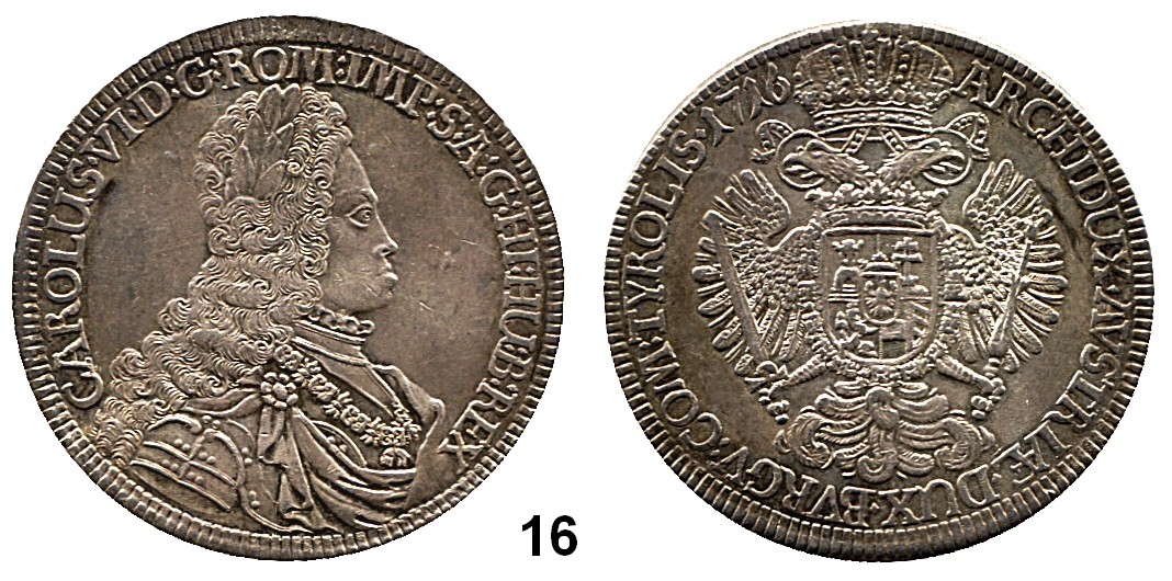 0016. Haus Habsburg Karl VI. 1711 – 1740 Taler 1716 Hall. 28,45 g. Herinek 335. Voglh. 259/II. Dav. 1051. Römisch Deutsches Reich Katalogseite Auktion: 164 Losnummer: 0016 Erhaltung: Vorzüglich Schätzpreis: 180,00 € Zuschlag: 450,00 €
