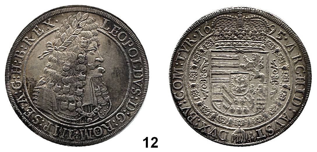 0012. Haus Habsburg Leopold I. 1657 – 1705 Taler 1695, Hall. 28,45 g. Herinek 642. Dav. 3245. Index: Tirol Römisch Deutsches Reich Katalogseite Auktion: 164 Losnummer: 0012 Erhaltung: Sehr schön – vorzüglich Schätzpreis: 180,00 € Zuschlag: 380,00 €