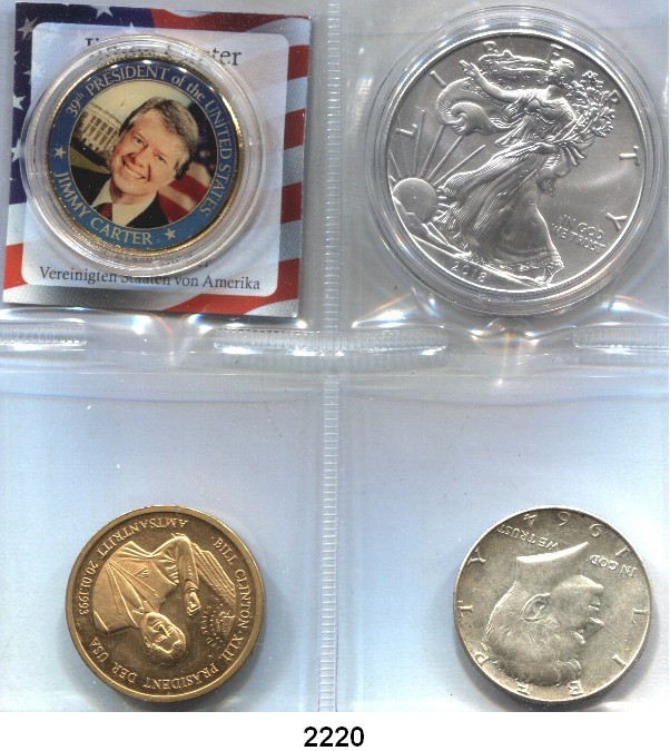 Half Dollar 1964; Half Dollar 2010 D, vergoldet mit Farbeinlage „Jimmy Carter“; 1 Dollar 2018 „Silberunze“ und Bronzemedaille 1993 auf Bill Clinton. LOT. 4 Stück.