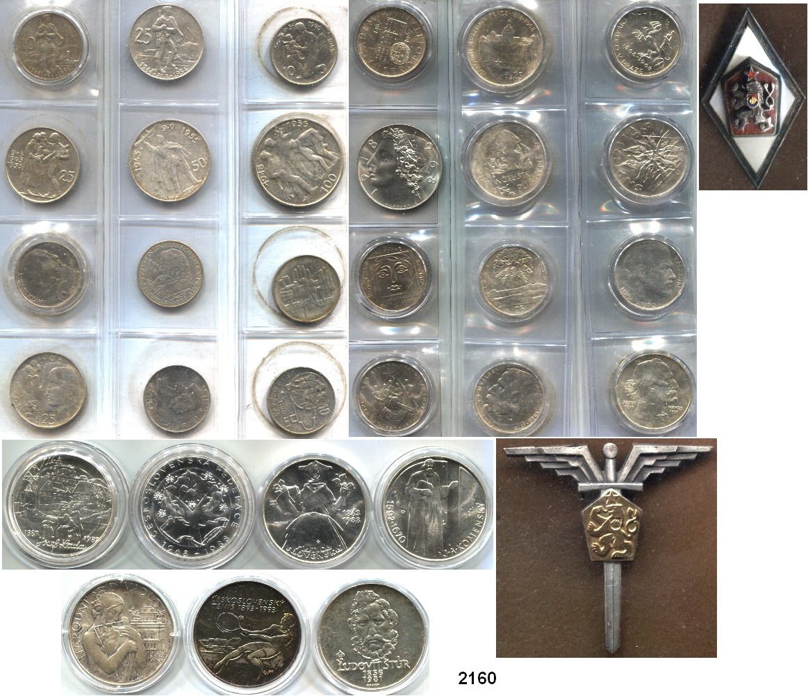 Tschechoslowakei/Tschechien, Umfangreiche Sammlung von 134 Münzen. Von 1 Koruna bis 500 Korun. Darunter 114 Silbermünzen u.a. 10 Kronen(9); 25 Kronen(8); 50 Kronen(25); 100 Kronen(49); 500 Korun(7); Beigegeben Böhmen und Mähren 17 Münzen und zwei tschechische Abzeichen. LOT. 153 Stück. In einem Album und vier Münzmappen.
