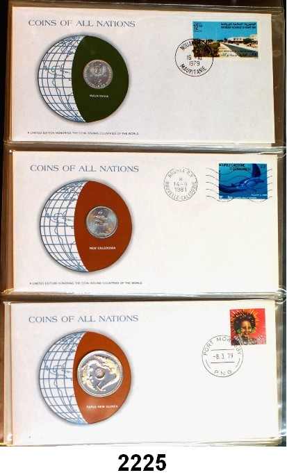Sammlung „COINS OF ALL NATIONS“. Kleinmünzen aus aller Welt, jeweils im Numisbrief. Zwei Ordner mit 151 Münzen. Beigegeben Kiste mit Beschreibungszettel zu jeder Münze.
